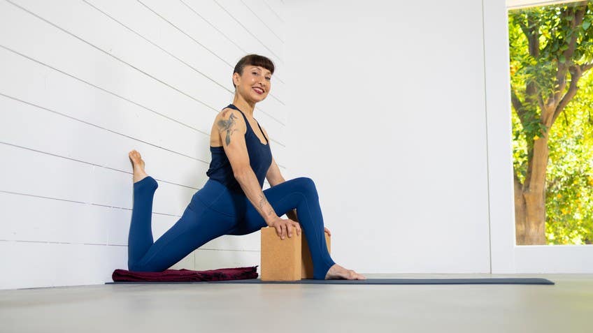 And we're gonna start off almost in what what will feel like a virasana. Right? So pushing into the blocks I'm gonna put my hands against the wall, just brace myself there, and push your torso all the way back back against the wall, heal right outside of your right hip. Breathe there, three breaths inhale. Exhale one, inhale. XL two, and this is in your quad, alright, and in your psoas, hip flexor, And that's three. From here, start to drift the hips forward, and you might need to scoot your left foot even a bit further forward.