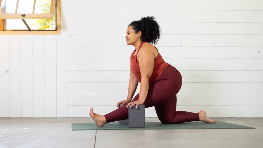 Press through the mound of your right big toe. Guide your right hip back and in and grow your heart forward. Walk your hands and or blocks forward any amount you can manage without pain or strain. And for every bit, the heart is reaching forward, guide the right hip back. This giant mango that Hanuman thinks he sees in the sky is actually the sun.