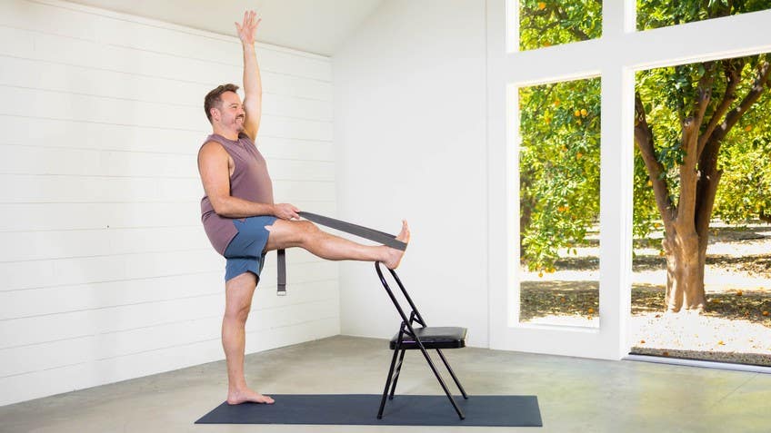 We're gonna place the strap around the ball of our right foot. So from here, what we wanna do is we wanna be able to send our right leg up onto the top of the chair. So that right above the heel, the top of the chair is supporting. And we're able to hold our leg. Bring your hands around the strap.