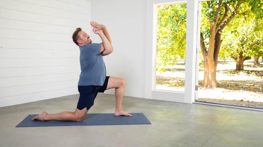 Big full breath in. Big exhale. Look forward between your hands, lunge your right foot forward between your hands, lower your back knee to the earth, and reach your arms up high on Janiasana. So guiding your right hip back in space, your left hip forward, we're gonna take our left arm under the right, finding eagle arms. So you're gonna connect the palms or grab your thumbs, start to reach the elbows out in front of you.