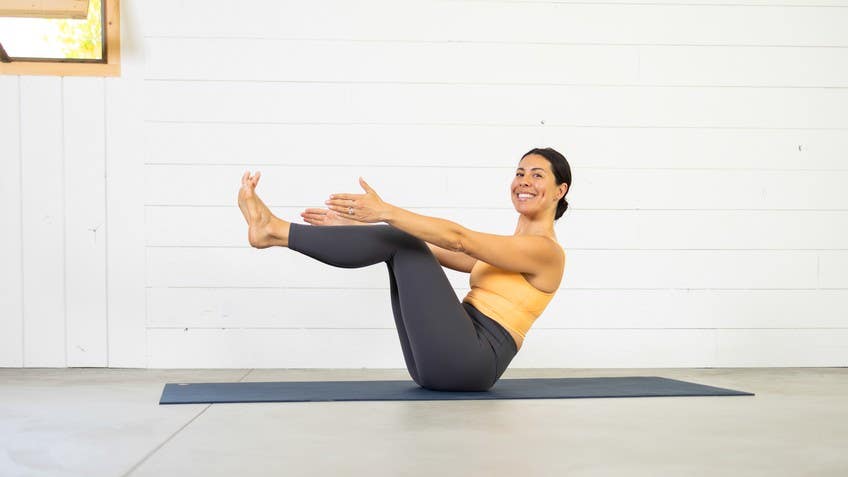 Until you come all the way down into boat pose. So this is particularly challenging. You can always put your heels down on the mat, hold the backs of the knees. Or backs of the thighs. You can also do it with the heels up and hold the back of the thighs.