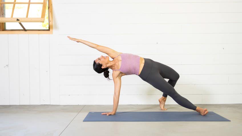 Right. So you are establishing really strong roots here, pressing down with the heel of your right. The ball of your back foot. We're gonna move dynamically. So start to straighten out your front leg, pressing the mound of that front foot into the earth, straighten the right leg, inhale reach up. As you exhale, rebend your front knee, take your arms in cactus.