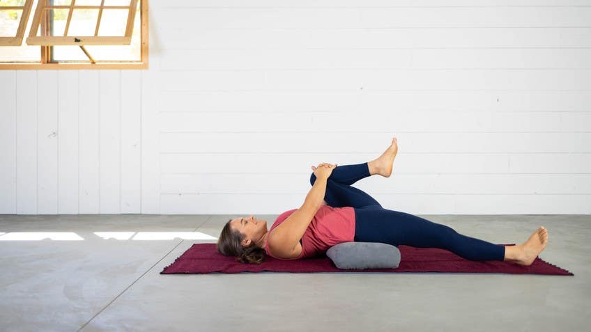 Press through the feet, lift your pelvis up. Slide the bolster right underneath your pelvis. Make sure it feels nice and cozy and supportive. And then draw your left knee into your chest. Begin to stretch your right leg long on the floor. You might keep your left knee in.