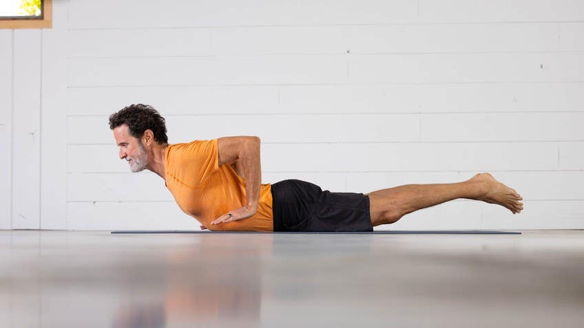 Inhale baby cobra lift. Now when you breathe out, hover your inner knees, your inner thighs off the mat, your hands are under your elbows, float them off the mat too. Everything is floating up in place. Take a deep inhale. Breath out, sweep your arms back.