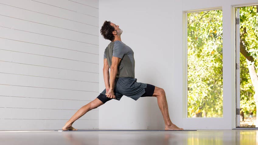 You're on the balls of your left foot this time. Breath in, crescent lunge, reach up to the sky like you're getting a big bar above your head. Breath out, pull down the bar, bend your left knee toward the floor, belly in. Inhale, reach up, crescent lunge, get the bar, breath out, pull down, bend your left knee toward the floor. Inhale, crescent, reach up, get the bar, breath out draw down, left knee lower, left knee lower, left knees on the mat. Inhale, Anjanae asana, heart up and back.
