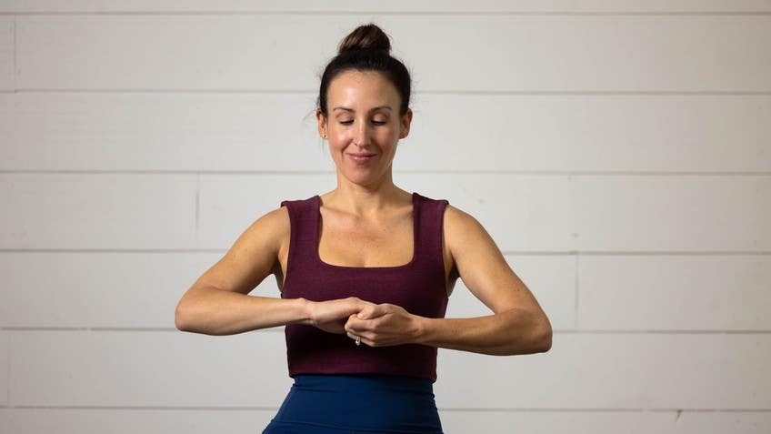 Infusing this shape and this breath with confidence stability of a strong foundation. Shapes at the hands to the heart in prayer, our last collective breath in together. And bow into the heart. Thank you for sharing your practice today.